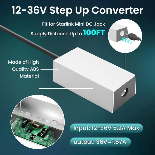 DC Step Up Converter]: This fit for starlink mini cable can stabilize 12V to 36V, effectively solve the problem of insufficient output voltage of cigarette lighter. The original fit for starlink mini power cable has a limited cable length of 30m/100FT and can provide continuous power supply to ensure the normal operation of the dish fit for starlink mini and prevent restart problems.