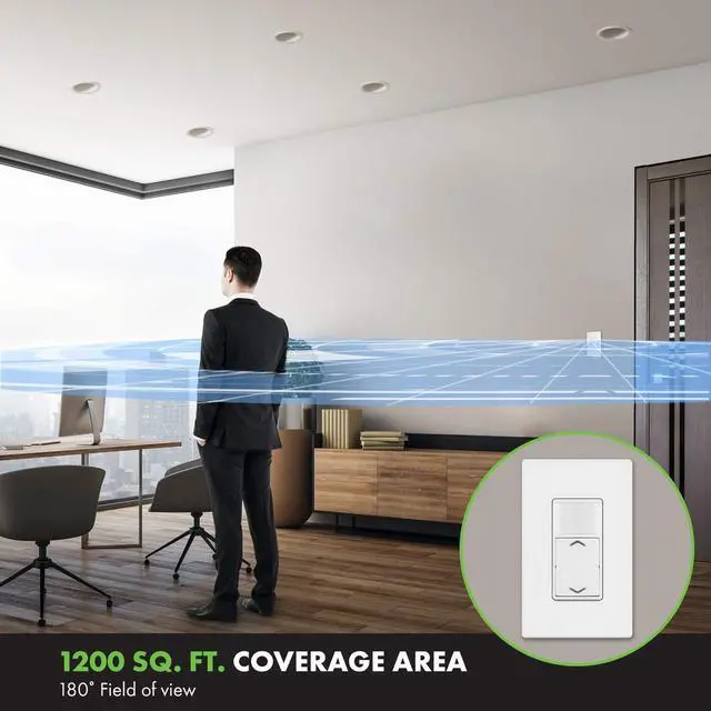 : For use with dimmable electronic fluorescent ballasts or dimmable LED drivers ONLY, neutral wire required, 120-277VAC, 800W max, 1200 sq ft coverage area, single-pole, wall plate not included, UL listed