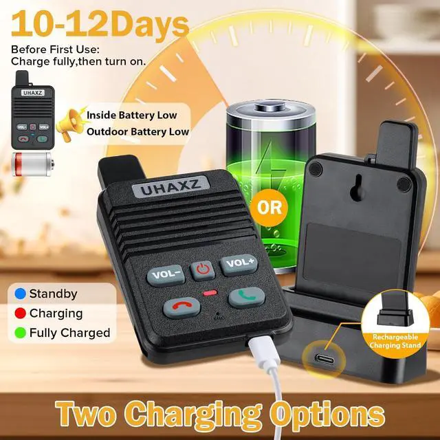 Work Out of Box: Pre-paired at the factory. Wireless doorbell intercom fully charge before first use. Receiver charges via power cord or charging base (just set it on the base when not in use). The transmitter charges via power cord. A full charge lasts 1012 days for the receiver and about 4 months for the transmitterthough actual runtime depends on how often you use the doorbell