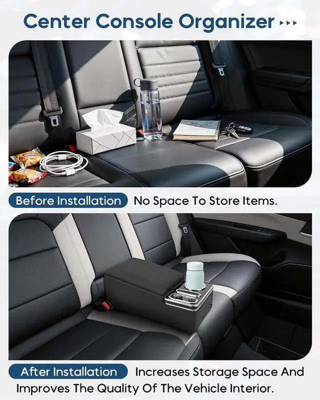 Easy Installation Bench Seat Center Console Armrest Size: 16.1"L x 8.7" W x 6.69"H (please measure whether the size is suitable before purchasing). Inseat Seatbelt Anchor Straps to Seat Gap next Bottom Velcro for Attaching to the Seat, You Can Install It in the Shortest Time Possible.