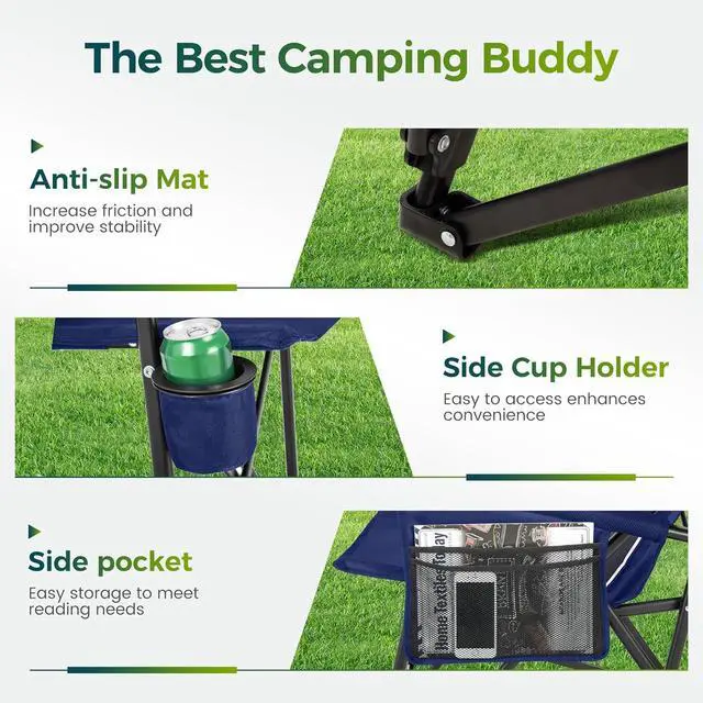 Large Storage SpaceThis camping chair for adults has all the storage you need. This chair features a huge magazine mesh pocket and a cup holder with a Textilene fabric bottom. It can store your phone, sunglasses, magazines, drinksand other essentials. Made of thicker 600D Oxford fabric, the folding camping chair is durable, tear-resistant, breathable, waterproof, and easy to clean. Perfectly suited for prolonged outdoor adventures.
