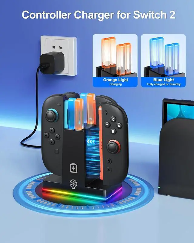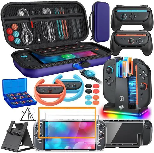 RGB Controller Charger: The switch 2 case accessories kits bundle also features a 4-in-1 controller charging dock station for Joy con 2 with LED indicators for real-time status. Magnetic ports enable charging after connect controller, no need to distinguish the insertion direction of the controller and built-in over-voltage /over-current/overheating triple protection