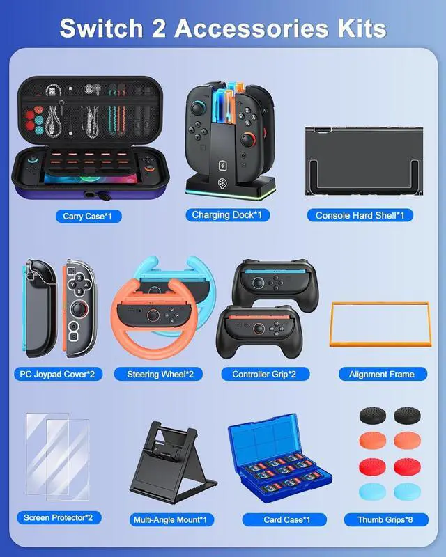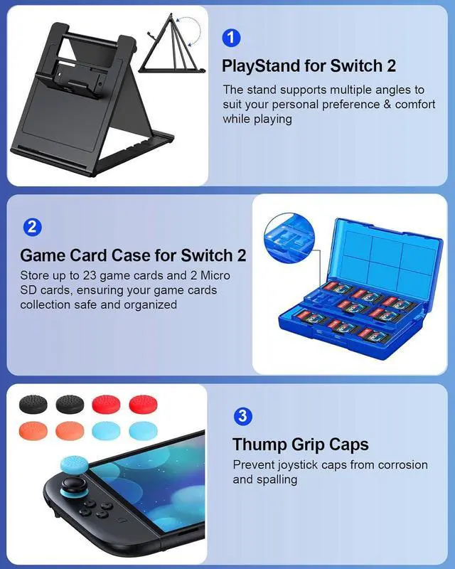 Clear Protective Cover and Screen Protector: The hard console protective shell protects your Switch 2 without blocking the kickstand. Plus 2 tempered glass screen protectors double-guard your console. scratch-resistant hard, even comes with 8 thumb grips provide full protection