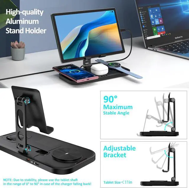 Super Humanized Design- This wireless charging station for has a built-in adjustable aluminum tablet stand holder, supporting both vertical and horizontal viewing. The hollow design makes it easy to use wired charging. Rubber padding of stand protects your device from scratches and sliding. [ATTENTION: Please use the metal tablet stand shaft in the range of 0°-90°, over 90° may cause the whole product to fall backwards. ]