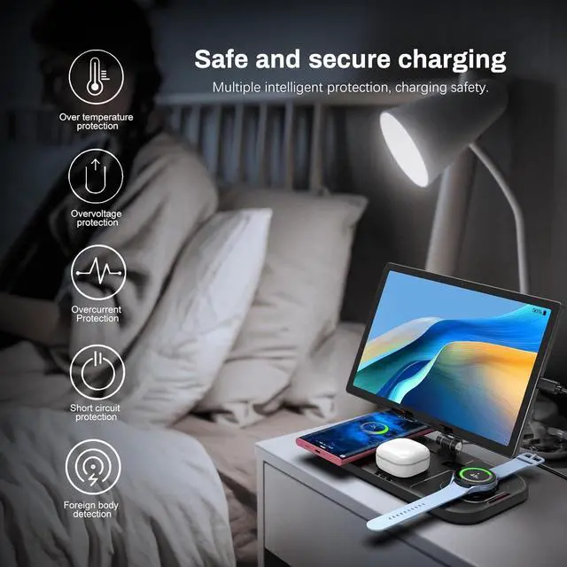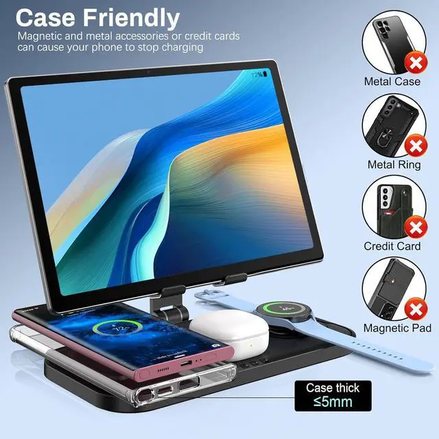 Multiple ProtectionThis wireless charging station for features over-current protection, over-voltage protection and over-charge protection technology, and plenty of bottom heat sink ports to prevent overheating, providing stable and safe charging for your phone and galaxy watch