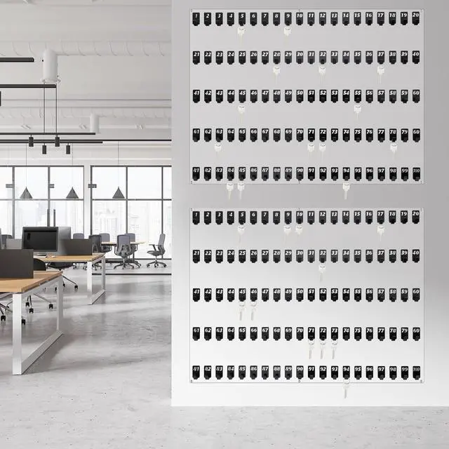 The key hooks board is made of acrylic, contains 100 numbered hooks, and does not require installation, helping you make full use of wall space
