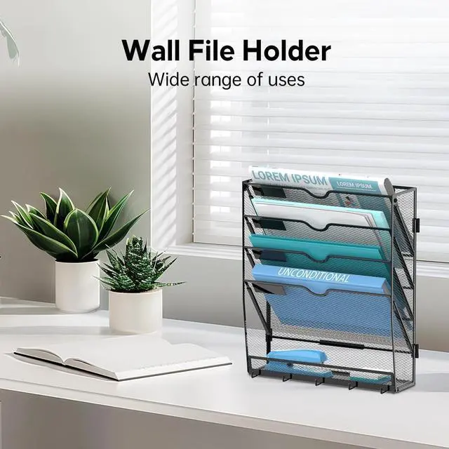 2 Pack 5 Tier Wall File Organizer - Hanging File Organizer with 5 Hooks, Mail Holder Wall Mounted for Papers, Folders, Magazines, Bills, Office&School Organization, Black
