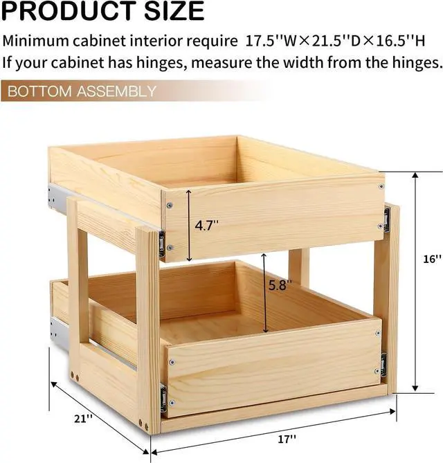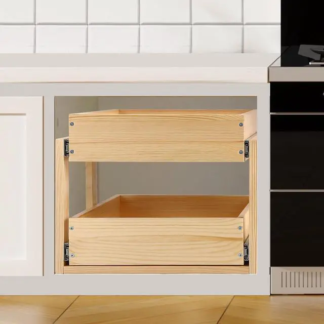 WHATS INCLUDED: 2 wood drawers with 2 pairs of full-extension 60 lbs soft-close drawer slides, baskets, screws, and a user manual. This cabinet drawer slide-out is suitable for use in cabinets, under sinks, and other similar spaces