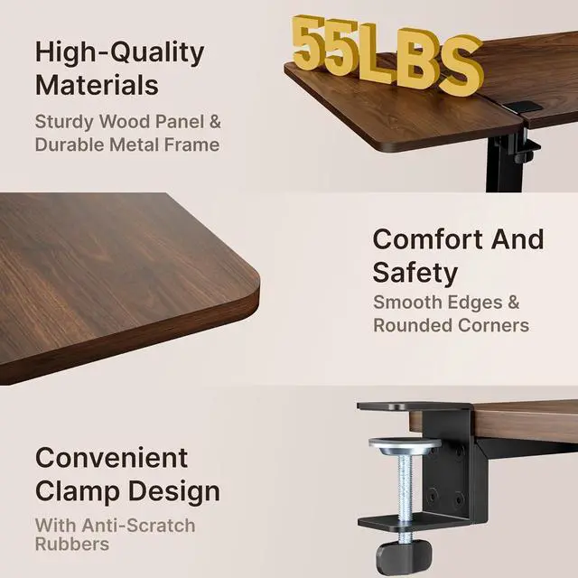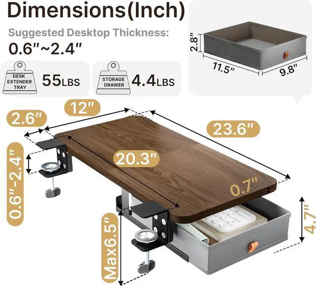 QUICK AND SECURE INSTALLATION: The clamp-on design enables fast, damage-free installation and fits desks 0.6" to 2.4" thick and at least 22" wide. It can be mounted on the front or side of your desk to suit various workspace layouts. Not compatible with raised, beveled, or irregular desktop edges.