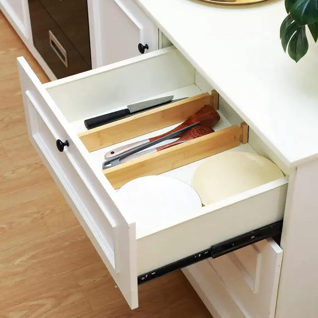 Use: the ends of these cutlery drawer organizers are made of quality non slip rubber, each drawer divider has a built in spring, which can hold the kitchen drawer organizer securely place, avoiding scratching or damaging your drawers, easily adjustable to meet your changing needs