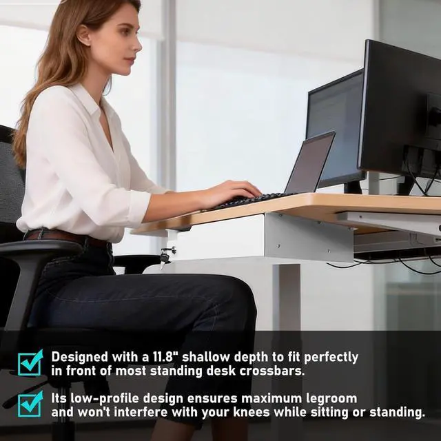 Universal Compatibility for Standing Desks Designed with modern workstations in mind. This pull-out organizer is fully compatible with most standing desks, height-adjustable desks, and traditional wood/metal workstations. Its slim, low-profile design ensures it won't interfere with your legroom or hit your knees while sitting or transitioning to a standing position.