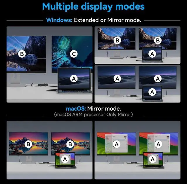 Note: Windows systems support MST mode, allowing you to freely use either extended or mirrored mode. Mac systems only support SST mode, so only mirrored mode is available, and both displays will show the same image