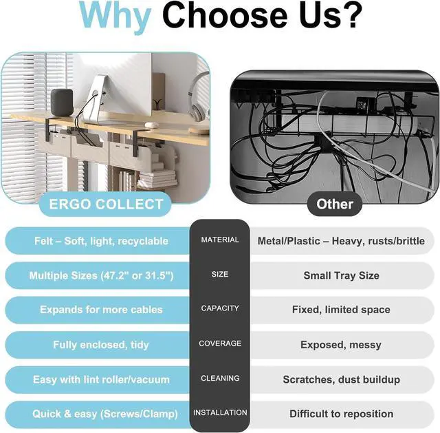 DURABLE FELT CONSTRUCTION Made from crack-resistant, rust-free felt, this under desk cable organizer and wire rack protects cables while maintaining a sleek look. Soft yet strong, its perfect for office, gaming, or home desk setups