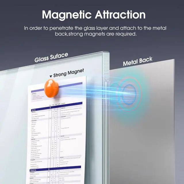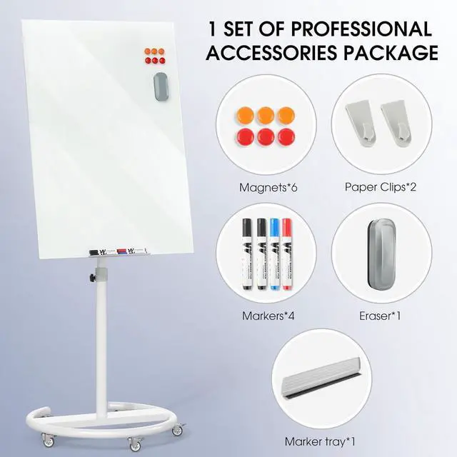 Complete Package & Accessories standing glass whiteboard comes as a full set including 4 dry-erase markers, 6 magnets, 1 eraser, and hooks, so you can start writing, displaying, and organizing right away without buying extra supplies.