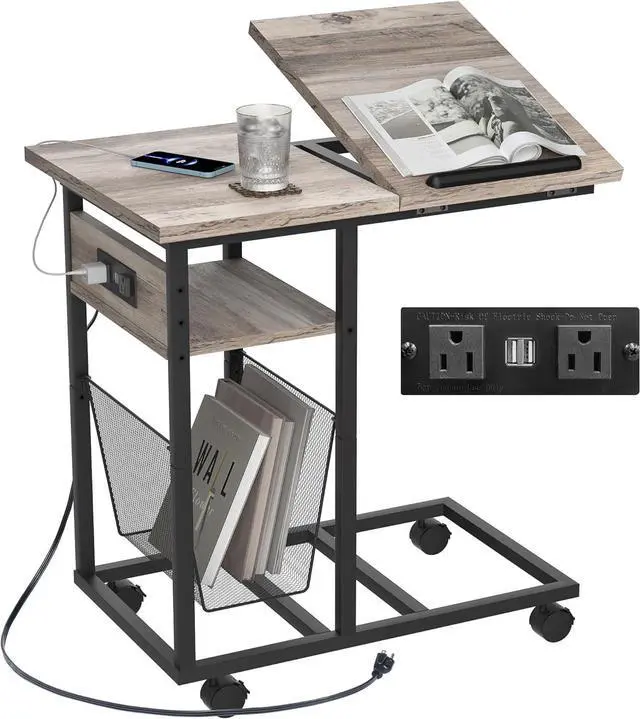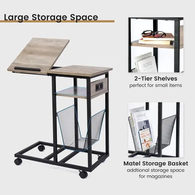 Side Table with StorageOverall Dimension of this sofa side table is 23.75"W x 11.75"D x 26.25"H. This c table with metal magazine holder provides more space for the laptop, magazines, books, etc. The lower shelf can be used to store some small items.