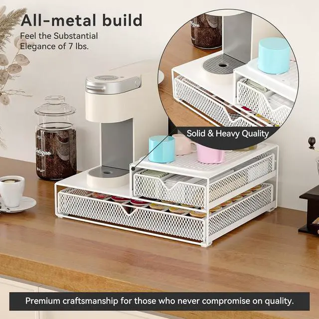 • [HEAVY-DUTY SOLID METAL CONSTRUCTION] Engineered from high-quality reinforced carbon steel, this coffee pod organizer is built to last. With a rock-solid foundation that supports over 60 lbs, it provides a stable, anti-vibration stand compatible with Keurig K-Cup machines. Unlike flimsy plastic or mesh drawers, our sturdy design ensures no sagging and no bending, keeping your coffee station professional and secure.