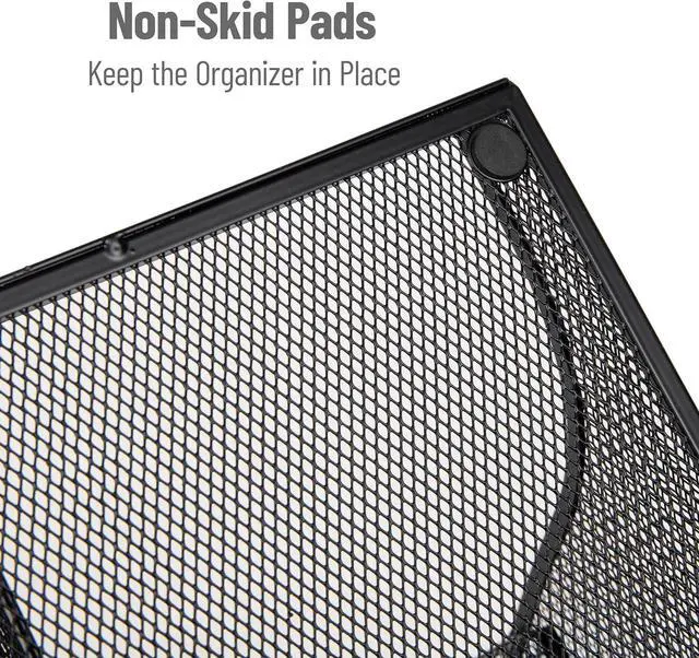 Designed for high-traffic office environments, the open metal mesh construction offers long-lasting durability while maintaining a clean, professional appearance. Rubber grips on the base help prevent sliding on countertops, helping the organizer stay securely in place during daily use.