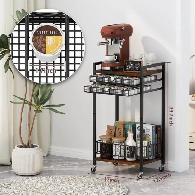 Save Counter SpaceThe double layer k cup organizer measures 12.5"D x 17"W x 33.7"H, can hold up to 84 K cups, easily meet your daily coffee needs. The top can hold a coffee maker and the under can storage coffee accessories without taking up too much space, making your countertop space more neat and organized