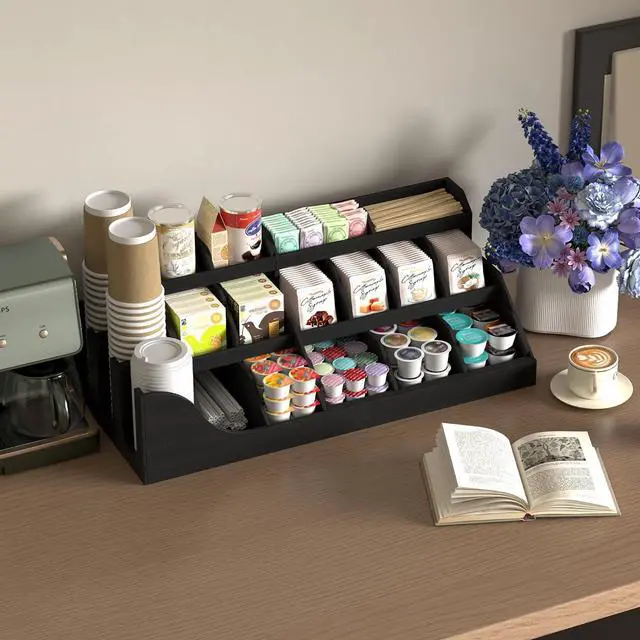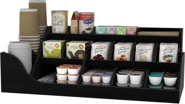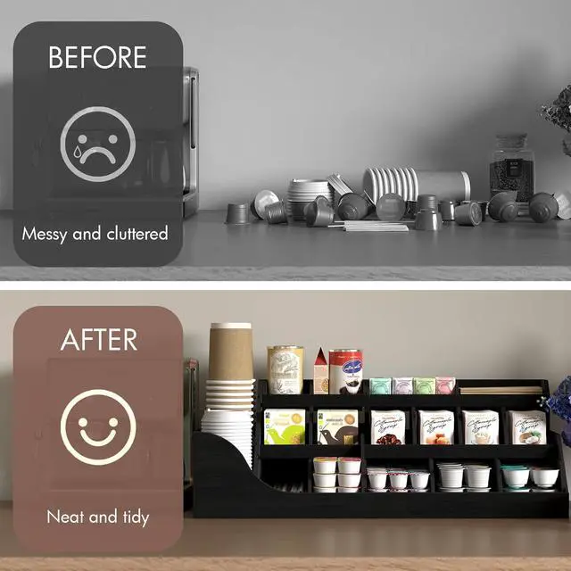 Extra Large CapacityThe dimension of this coffee bar organizer: 27*12* 9.8 inches. The bottom storage area holds approximately 100-120 coffee capsules. The sloped top design allows easy access to coffee bags without reaching all the way to the bottom when supplies are running low.