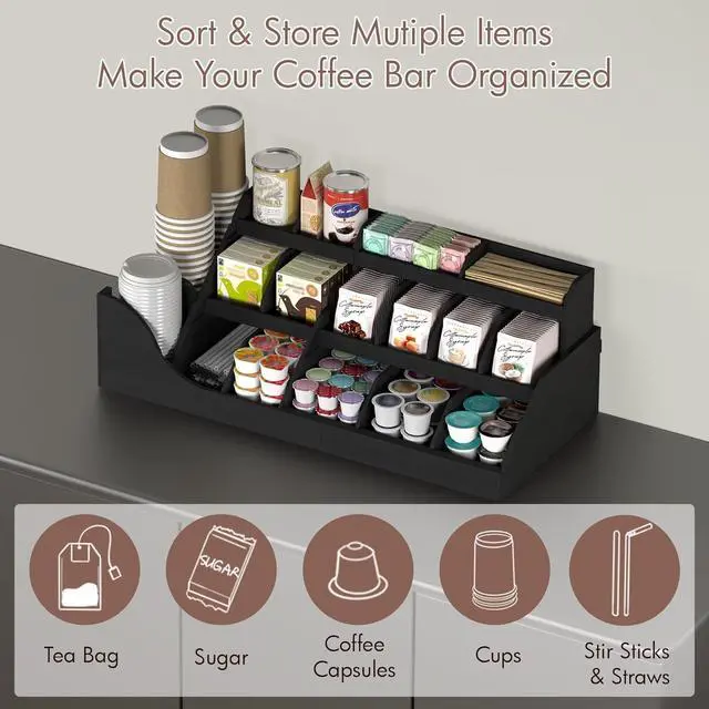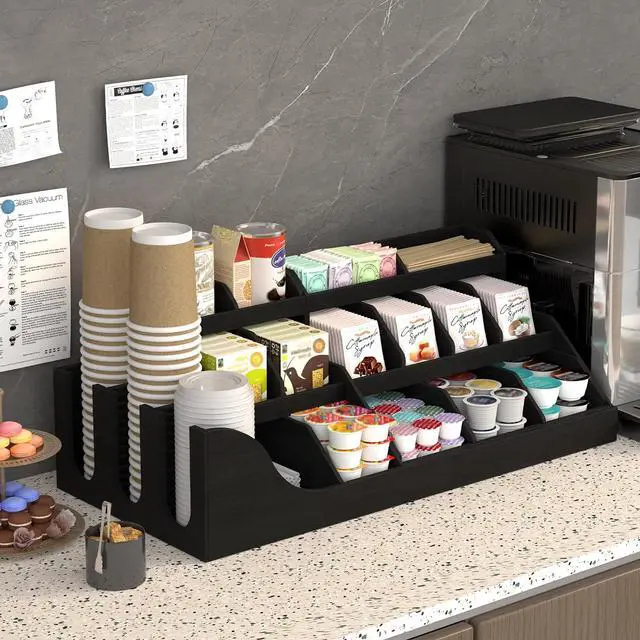 Easy Access for Station Accessories: The countertop coffee station organizer features four enlarged silicone pads on the bottom for stable placement and slip resistance. Its black finish complements various home decor styles.