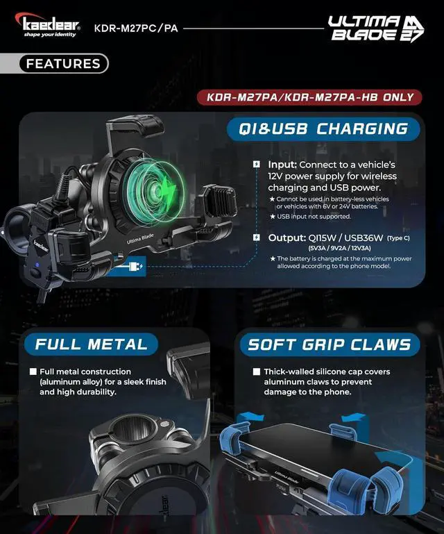Material: Aluminum alloy (body, mount), Polycarbonate (QI charging), Silicone (protective cover).
