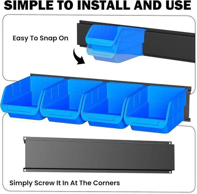 Package include: 4 pcs steel rails with 16 pcs sturdy bins, 4 bins per section. Maximum weight of 22 lbs per bin