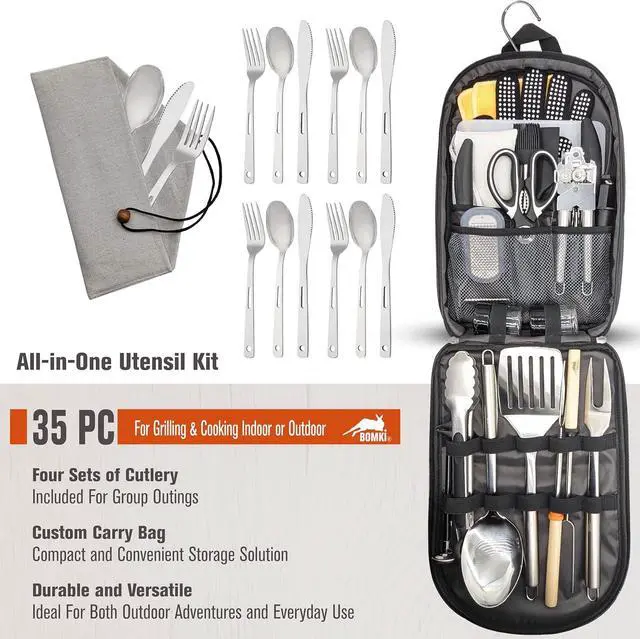 The Ideal Gift for the Outdoor Enthusiast >> Our BBQ grill set, a part of this comprehensive camping cooking utensils set, is the perfect gift for outdoor and kitchen cooking enthusiasts. It's a dream camping kitchen kit for passionate campers who love cookouts. Be it a birthday, Christmas, Fathers Day, Valentines Day, or self-indulgence, this complete camping cooking utensil set ensures you won't have to borrow tools from neighbors during camping, picnicking, or beachside cooking.
