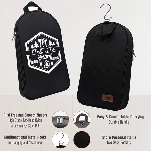 Practical and Organized >> The camping utensil set features a tailored design that keeps all your camping cooking gear neatly organized. It comes with individual pockets to protect your camping kitchen utensils from scratches during travel. Whether you're tailgating, camping, or just enjoying the great outdoors, this camping utensil set is a must-have for your outdoor cooking needs.