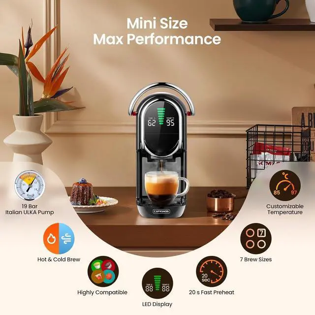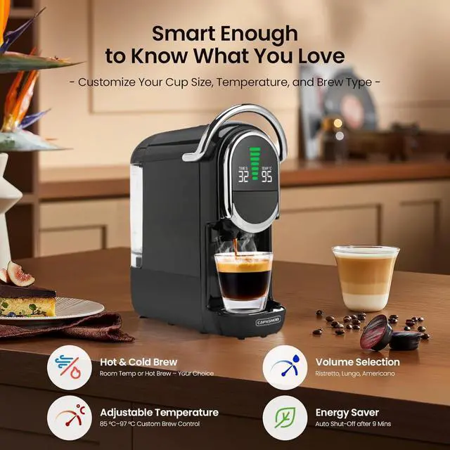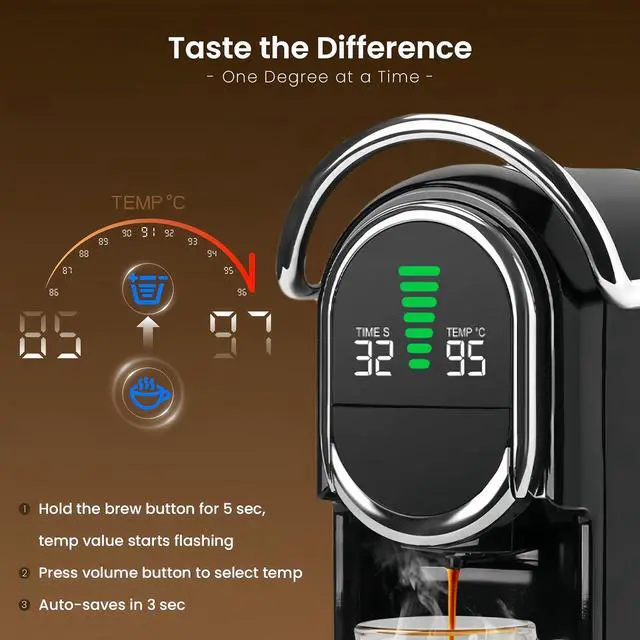 [Customizable Brewing Experience] The espresso maker offers seven brew sizes, allowing you to customize your coffee strength and cup size. The adjustable temperature range (8597°C) lets you tailor the heat for optimal flavor