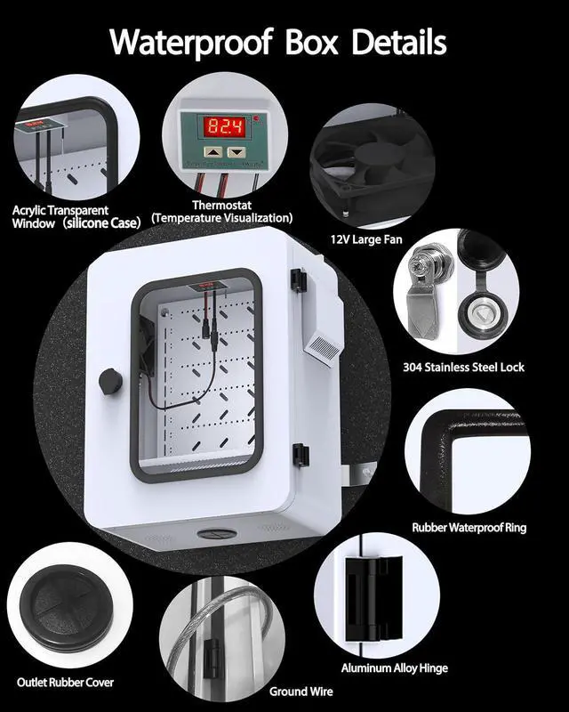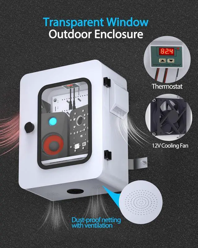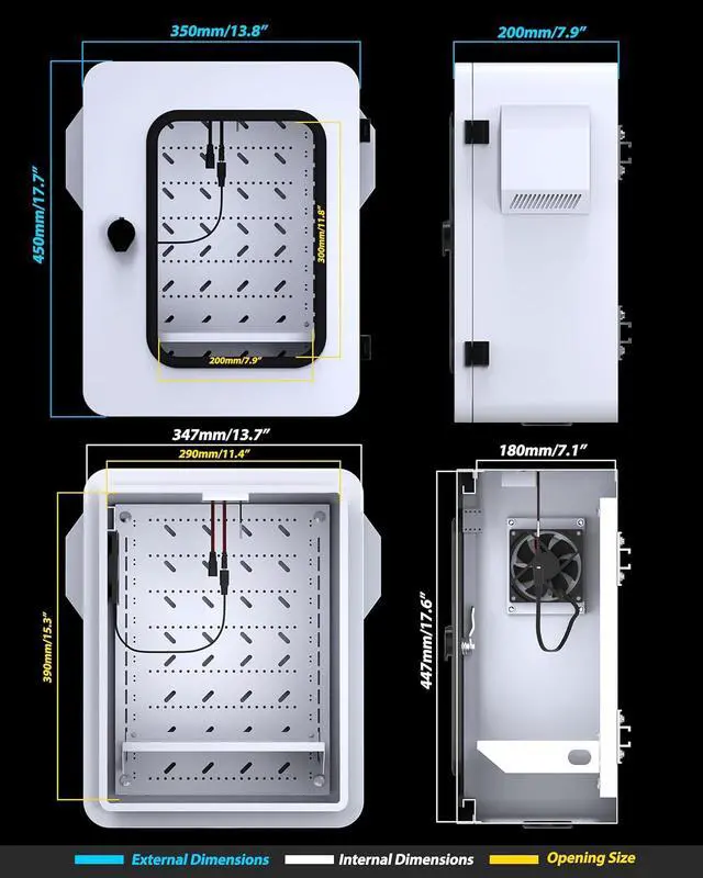 ONE PIECE VENT DESIGNThe vent on the left side of the electrical box has a built-in fan as well as a temperature controller. The fan exhausts heat from the vent on the left side of the waterproof electrical box while drawing in cool air from the right side face and bottom.