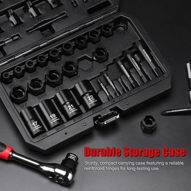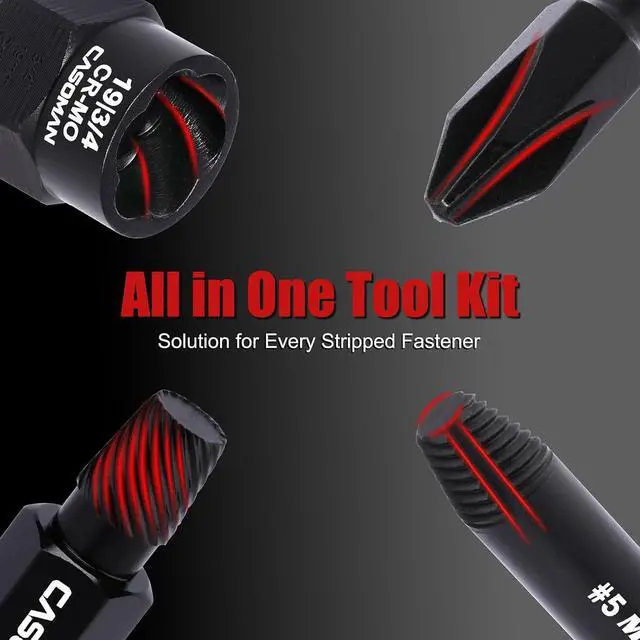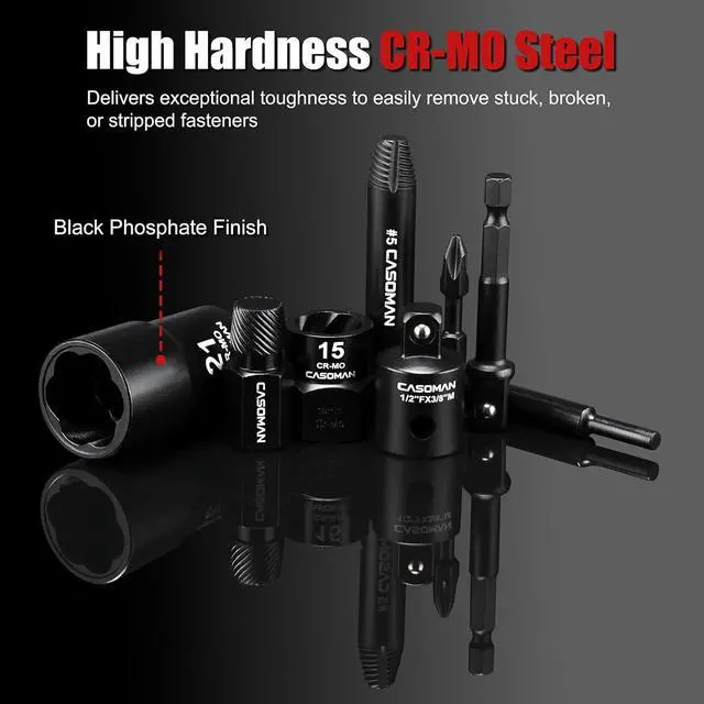 This 3/8" Drive Impact Bolt & Nut Extractor Socket Set is an ultimate solution for removing your damaged, rusted, or stripped fasteners. Its reverse spiral flutes design helps sockets bite for maximum gripping powerthe more you turn, the tighter the socket grips. Made from drop-forged and heat-treated chromium-molybdenum (CR-MO) steel construction, these impact-grade sockets withstand extreme force, while the black phosphate finish resists corrosion for long-lasting durability. Laser-etched markings ensure quick size identification, even in low-light conditionsmaking this set a must-have for professionals and DIYers tackling tough jobs.