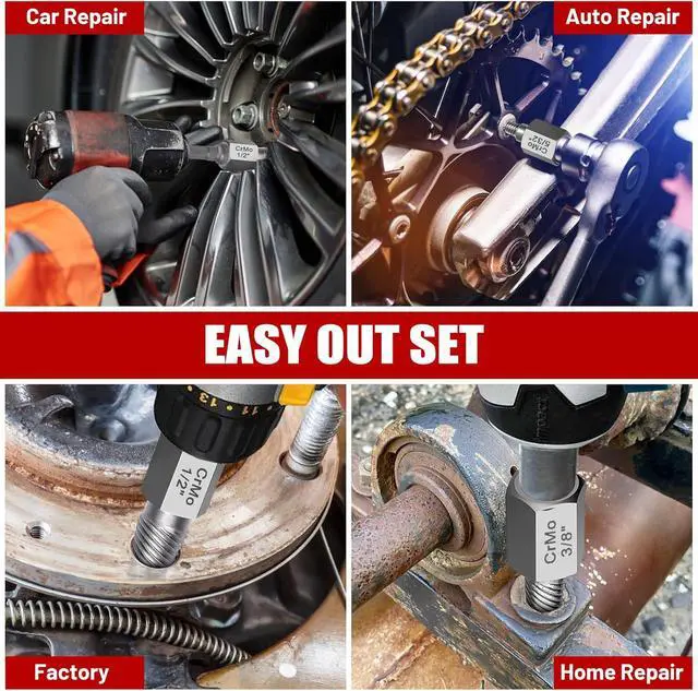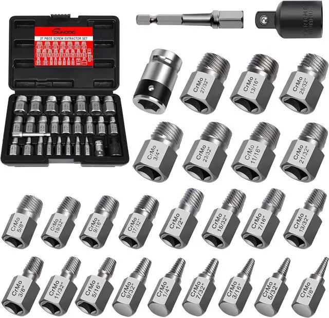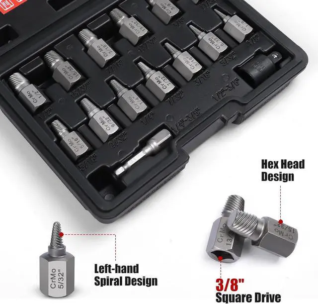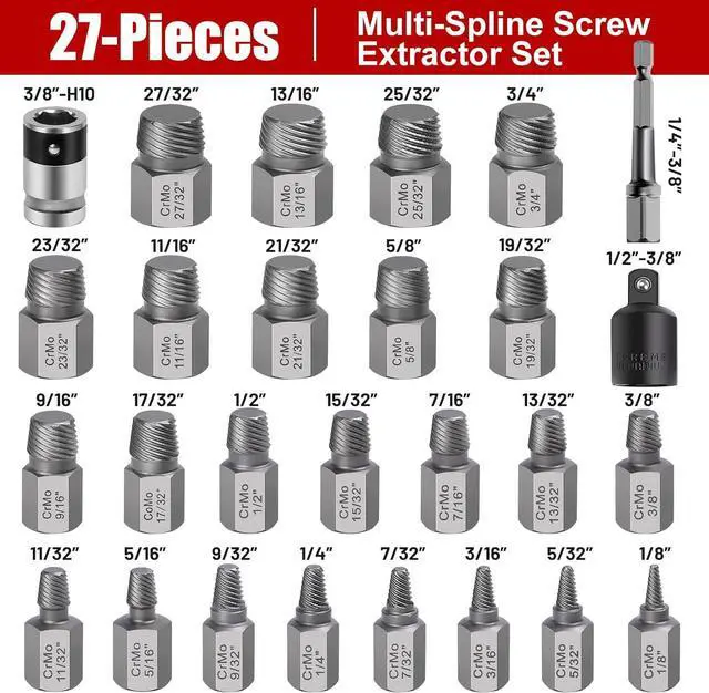 Multiple Sizes And Easy To ReadThe Easy Out Extractor Set Contains 1/8", 5/32", 3/16", 7/32", 1/4", 9/32", 5/16", 11/32", 3/8", 13/32", 7/16", 15/32", 1/2", 9/16", 17/32", 5/8", 19/32", 27/32", 13/16", 25/32", 3/4", 23/32", 11/16", 21/32" 3/8"-1/4" Hex Adapter, 3/8"-1/2", 3/8-H10 Bit Holder. All The Size Is Engraved Clearly On The Socket For Easy Identification.