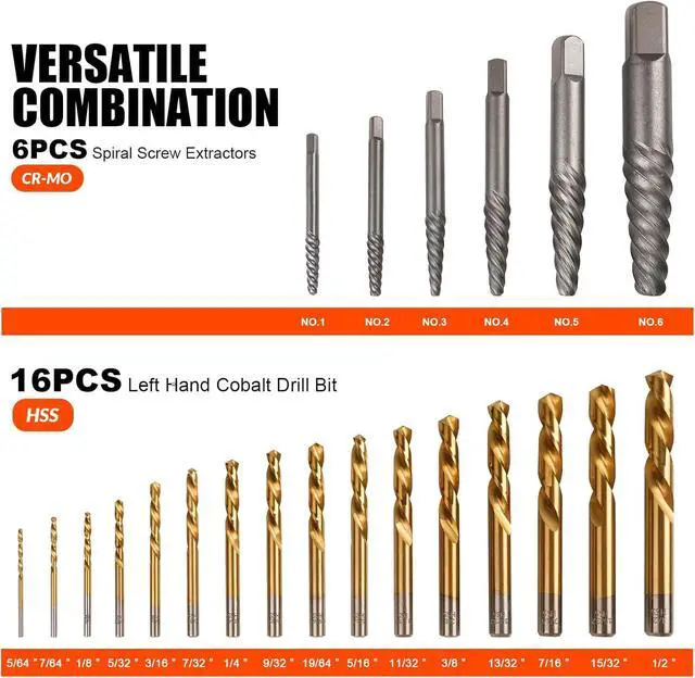 PRECISION&SHARP - High-speed steel material with titanium coating drill bits enhances hardness and wear resistance. 135°angle makes bits easier to cut into the workpiece and has less axial resistance providing an effective removal space without damaging other working areas. Left-handed flute design run impact wrench in reverse also improves the effect of spinning broken bolts out.