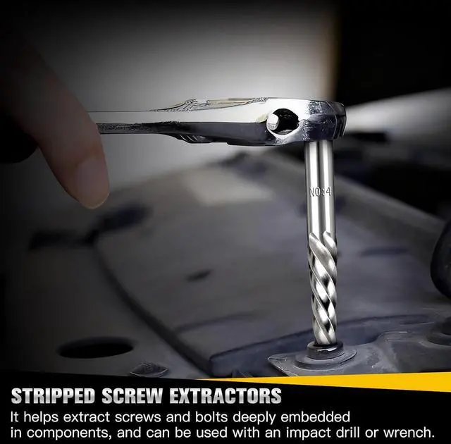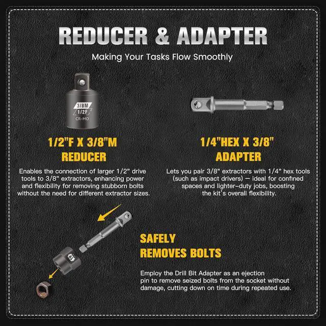 Premium AccessoriesThe impact socket reducer (1/2"F to 3/8"M) in this set enables the adaptation of socket interfaces of different specifications, and the impact drill bit adapter (1/4"hex to 3/8" square) allows an electric drill to drive the extractor tools. As key conversion accessories, they not only expand tool compatibility but also enable electric disassembly, helping to efficiently extract damaged screws, nuts, and bolts.