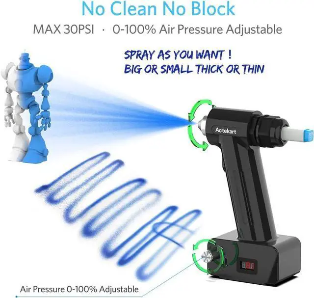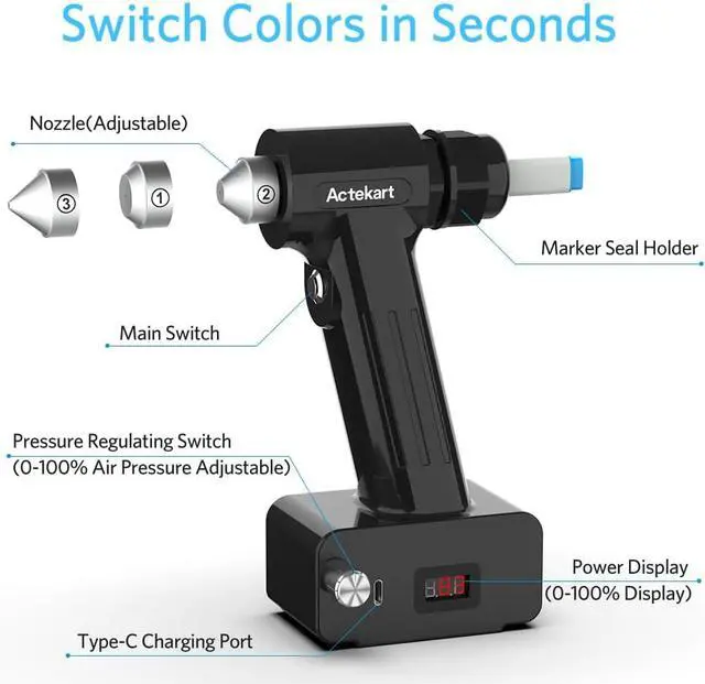 0-100 Battery Level Display: The integrated 2000mAh 7.4V rechargeable battery in the marker airbrush allows for a continuous working time of two hours. The 0-100 battery level display allows for efficient time management and extends the device's lifespan. The marker sprayer are ergonomically designed and automatic on-off function, press to start and release to stop, making it easy to use.