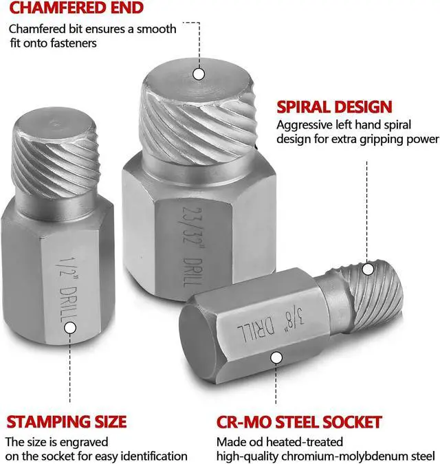 25-PIECE BOLT EXTRACTOR: The broken screw remover comes with a heavy-duty carrying case, lets all the multi-spline screw extractors stay organized. It contains 7/8", 27/32", 13/16", 25/32", 3/4", 23/32", 11/16", 21/32", 5/8", 19/32", 9/16", 17/32", 1/2", 15/32", 7/16", 13/32", 3/8", 11/32", 5/16", 9/32", 1/4", 7/32", 3/16", 5/32", 1/8", meets all your needs.