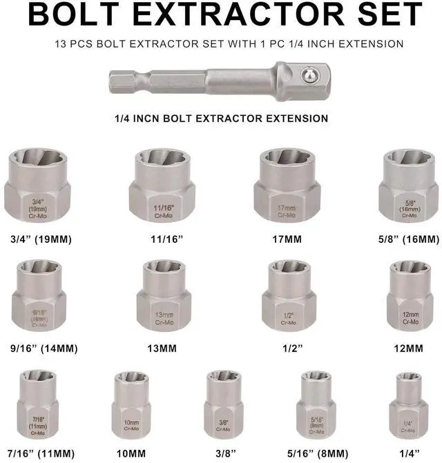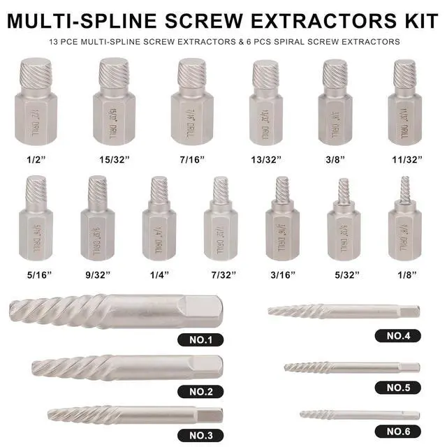 Spiral screw extractors: Along with regular screw extractors, the kit also provides 6 spiral screw extractors. These extractors are characterized by their numbered sizes (NO. 1 to NO. 6) and are useful for removing stubborn or broken screws.