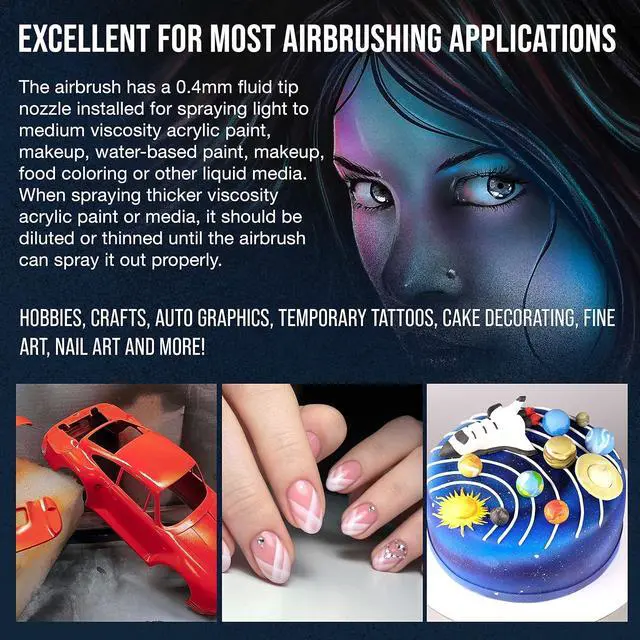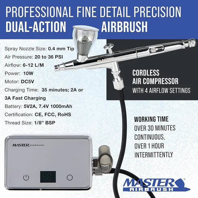 The included professional fine-detail precision dual-action airbrush has a 0.4 mm tip and five sizes of gravity feed cups. The airbrush has a cutaway handle that allows you to quickly flush fluid passages, while the preset control knob enables control of the paint flow to create repeatable lines.