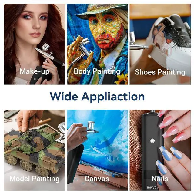 Wide Application The air brush kit with air compressor is suitable for beginners as well as for professional artists since its great performance for a variety of applications such as painting, model painting, makeup, cake decorating, temporary tattoo, nail beauty, facial care, car & helmet painting, T-Shirt painting, shoes painting, barber shop, etc