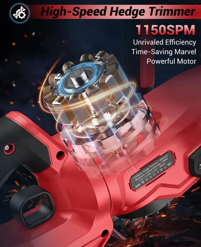 SMART SAFETY: This battery hedge trimmer features an automatic feed system that actively pushes branches forward, ensuring smoother cutting, reducing jams, and enhancing operational fluidity. Equipped with a dual-protection safety switch mechanism, it prevents accidental activation, safeguarding operator safety for worry-free operation