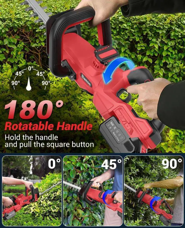 180° FULLY ADJUSTABLE HEAD & REACH ANY ANGLE EFFORTLESSLY: This battery operated hedge trimmer features a 180° rotating cutting head that adjusts to almost any angle, so you can easily trim high hedges, low bushes, and tight corners without awkward bending or stretching. More versatile than trimmers with only 0°90° adjustment, this hedge trimmer lets you shape your entire landscape with less fatigue and better results