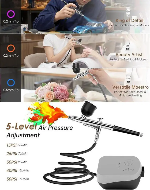 Widely Used: Whether you're a beginner or an accomplished artist, this air brush painting set is easy to master and use. It delivers stable performance and is suitable for various applications including airbrushing, miniature painting, model painting, traditional painting, nail art design, artistic sketching, cake decorating, and more