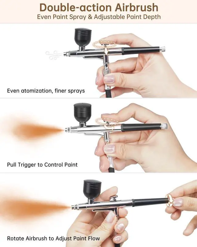Non-Clogging Dual-Action Technology: The portable airbrush kit with compressor features a double-action trigger, allowing precise control of airflow and pigment flow through the fluid adjustment at the end. The removable tail of the airbrush accommodates various art needles, ensuring smoother, more efficient operation and preventing clogging. Suitable for both beginners and professionals, it excels in intricate nail designs and complex artistic creations
