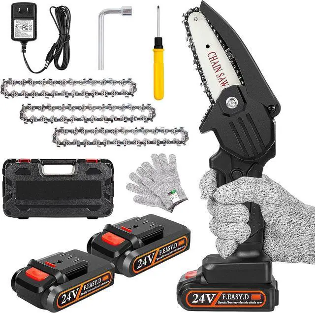 ONE HAND USING: This 4 inch mini chainsaw has an ergonomic non-slip handle, easy and comfortable to operate. The body + battery weighs only 2.4 lb, females can easily control and use it and will not feel tired after a long time working. Easy, consistent one-handed use. Easy to tote around, trimming vines, branches, saplings, bushes, even kindling and small logs for firewood as you go. Without needing the gas and oil of conventional chainsaws, and does the same job without the noise and smoke.