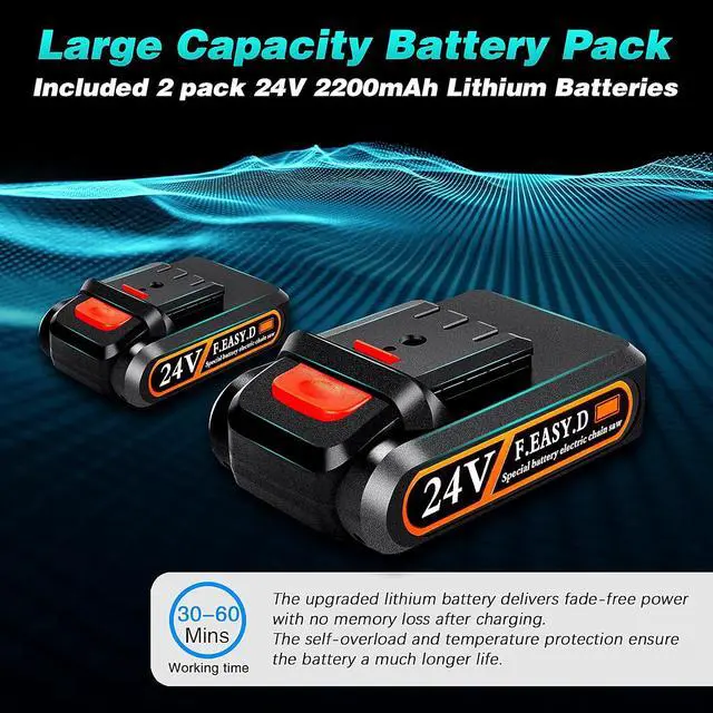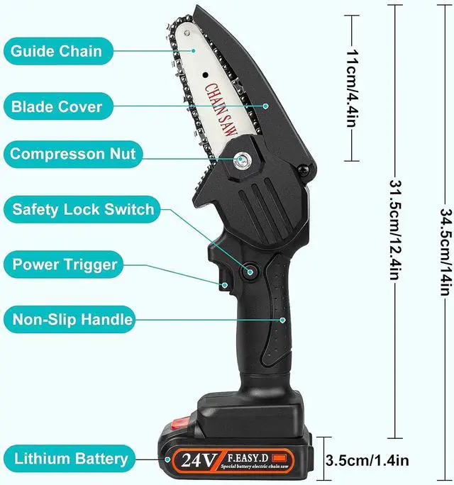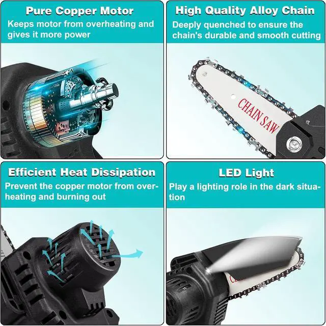 UPGRADED MINI CHAINSAW: Our cordless mini chainsaw has added a safety lock switch and blade covers. The safety lock and trigger must be pressed simultaneously to start the saw and the blade cover prevents wood chips from splashing during the work. The double safety protection design can reduce more accidents and secure your safety. We have also added LED light to the chainsaw to light in the dark.