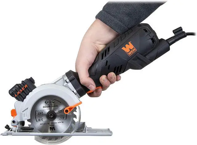 Remember when you could make cuts quickly and easily? The 5-Amp 4-1/2-Inch Mini Circular Saw provides versatile and powerful performance all in the palm of your hand. Perfect for wood, drywall, tile, sheet metal, pipes, and more. Its compact design weighs in at a mere 5.1 pounds, limiting fatigue during operation and making for easy storage between jobs. The 5-amp motor provides maximum torque, spinning the 4-1/2 inch blade (115mm, 10mm arbor) up to 3500 RPM. Attack boards up to 1-11/16 inch in thickness or bevel the baseplate for 45-degree angled cuts in workpieces up to 1-1/8 inches thick.