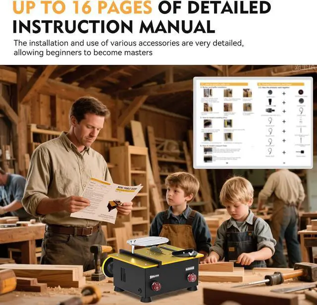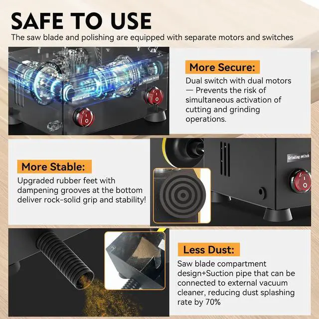 Upgraded Shock-Absorbing Rubber Feet + Precision Cutting SystemEquipped with newly designed non-slip, shock-absorbing rubber feet with threaded detailing, shock absorption is improved by 75%, enhancing stability during operation and reducing inconveniences and accidents caused by vibration. The worktable features a precise 12cm scale ruler paired with a 180° adjustable guide fence, meeting most of your precision craftsmanship needs.