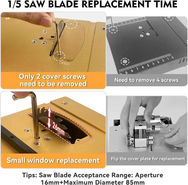 First Small Window Blade Change + Smart Zoning25 years of innovation, the small window blade change design allows for blade replacement by removing just two screws, saving 80% of the time compared to disassembling and installing blades on older small table saws. To extend the motor's lifespan, an internal dedicated blade compartment prevents dust from splattering and affecting motor operation, while an external dust extraction tube is included for dust collection and cleaning.
