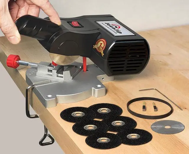 Includes 3 Blades - 2 HSS, 2 5/16" HSS, 2 5/16" Black Cut off Wheel (3/8 inch arbor), 71" power cord, miter guage holder, table clamp, motor brush replacements, and hex key