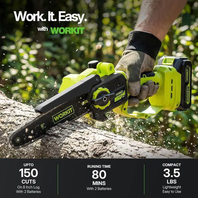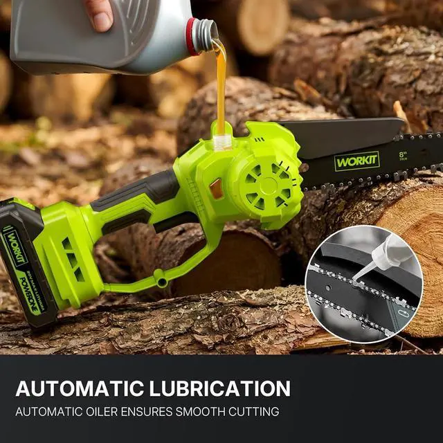 Ready Out Of The Box: This battery powered chainsaw comes pre-assembled, simply insert the battery to begin your first cut. Package includes1 × battery chainsaw 8 inch, 2 × 2.0A h batteries, 1 × 8" Bar, 2 × 8" Chain, 1× charger, 1× toolbox, 1× gloves, 1× goggles, 1× empty oil bottle, 1× File